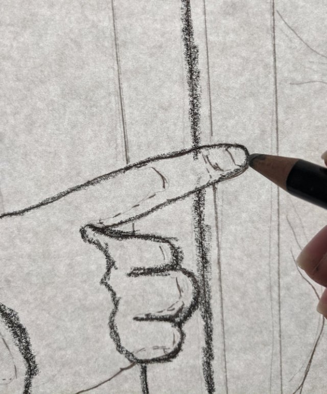 Soft pastel would give me plenty of control over lighting and detail. Though I would have liked the fun of making it in color, I went with grayscale to simplify the composition a bit. I chose a mid-toned, lightly textured paper which was delightful to draw/paint on, but it was also too dark to trace a sketch directly over the reference photo.