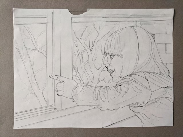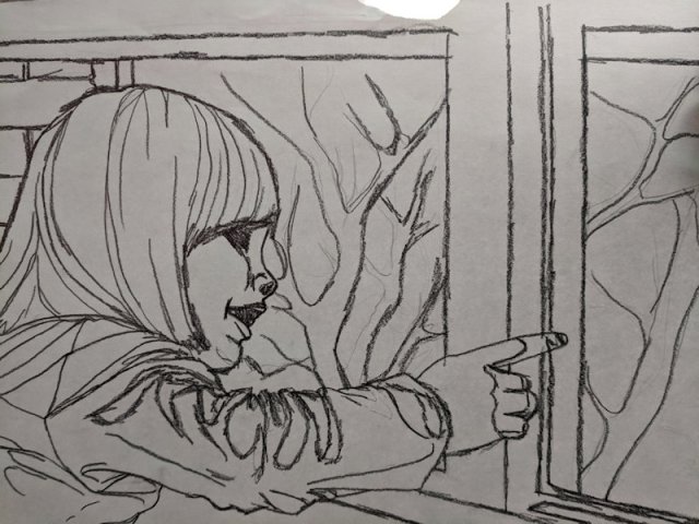 Though I was impatient to draw my subject, I blocked in the composition surrounding the subject first, working top down and saving her for last to lower the chances of smudging my work. The window was first, followed by the scene outside. This one had a lot of fun textures–the shiny wood window frame and the trees and brick wall outside.
