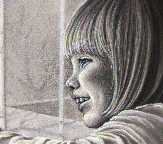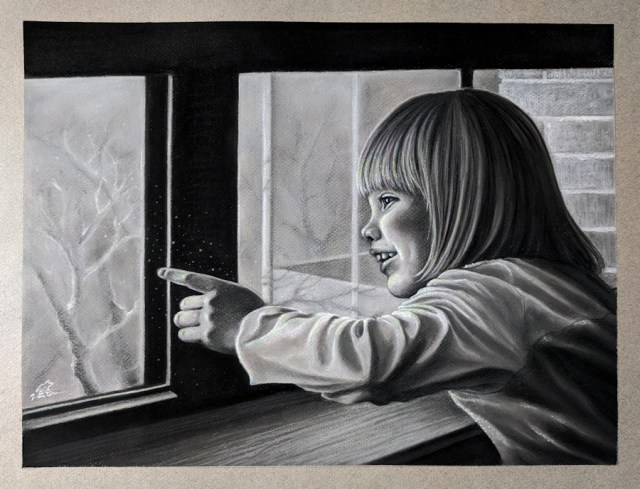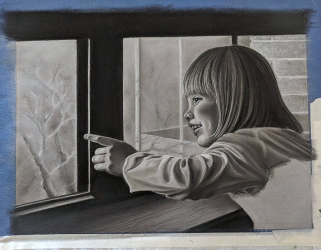 Now with piece nearly done, it resembled my daughter enough for my liking. However, it seemed a bit “off”–the quiet greys and leafless trees were oddly lifeless compared to the energy of the picture’s subject. Then, I had an idea.