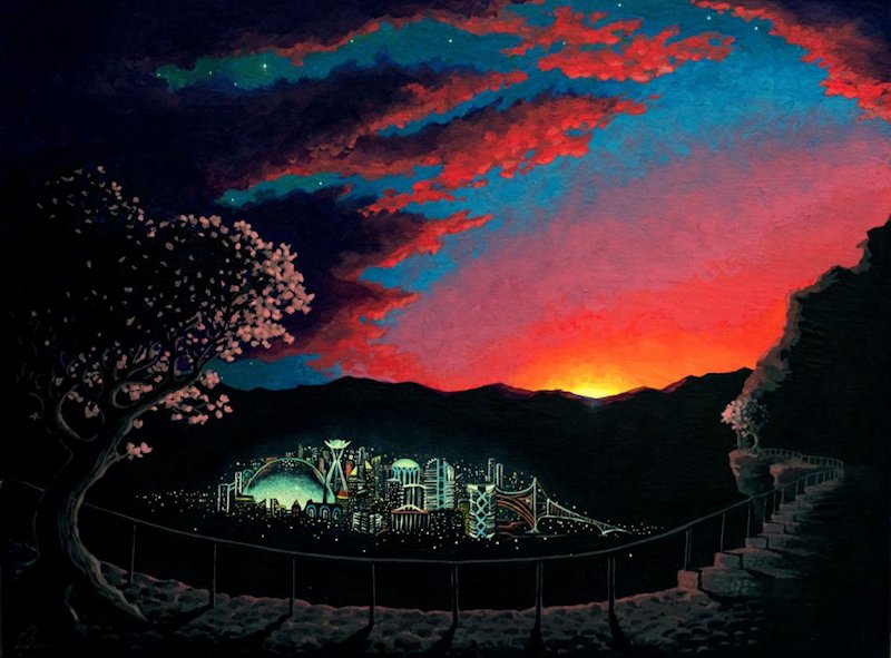 The viewer stands on a fenced cliff, in view of a colorful sunset and a strange city set in a mountain-rimmed valley. Whether the city is distant in time or distant in space is unknown.