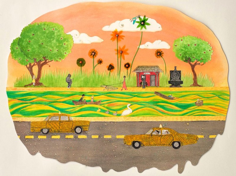 A playful, dreamlike interpretation of the famous 1967 song–faithfully recreated in collage using newspaper, gemstones, brads, holographic stickers, cellophane, and paper.