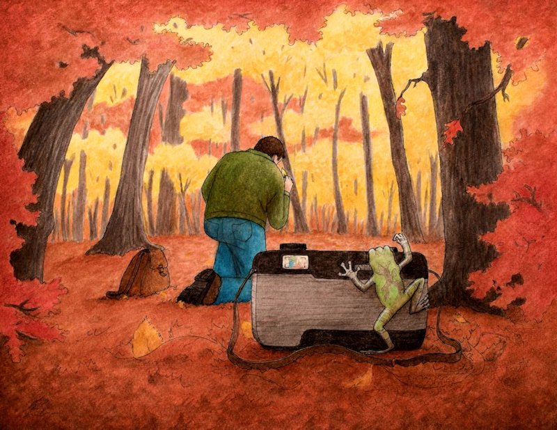 A hiker has momentarily set aside his camera to inspect a leaf in an Autumn woodland setting. An equally curious observer secretly photographs him, sure to create a mystery when the photograph is later discovered.